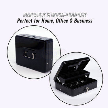 The Metal Cash Box with Key Lock is a durable and secure storage solution for cash, coins, and valuables. Made from heavy-duty steel, it features a cantilever money tray with compartments for coins and additional space for bills, receipts, and documents. The key lock system ensures security, and the spring clips keep bills organized. Ideal for both indoor and outdoor use, this versatile box is perfect for homes, offices, stores, and more.